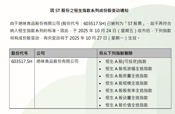 恒指公司10月8日发布通知称,由于绝味食品股份有限公司已被列为ST股票,故不再符合纳入恒生指数系列的标准。因此,于10月24日(星期五)收市后,绝味食品股份有限公司将从恒生A股(可投资)指数等指数中被剔除。